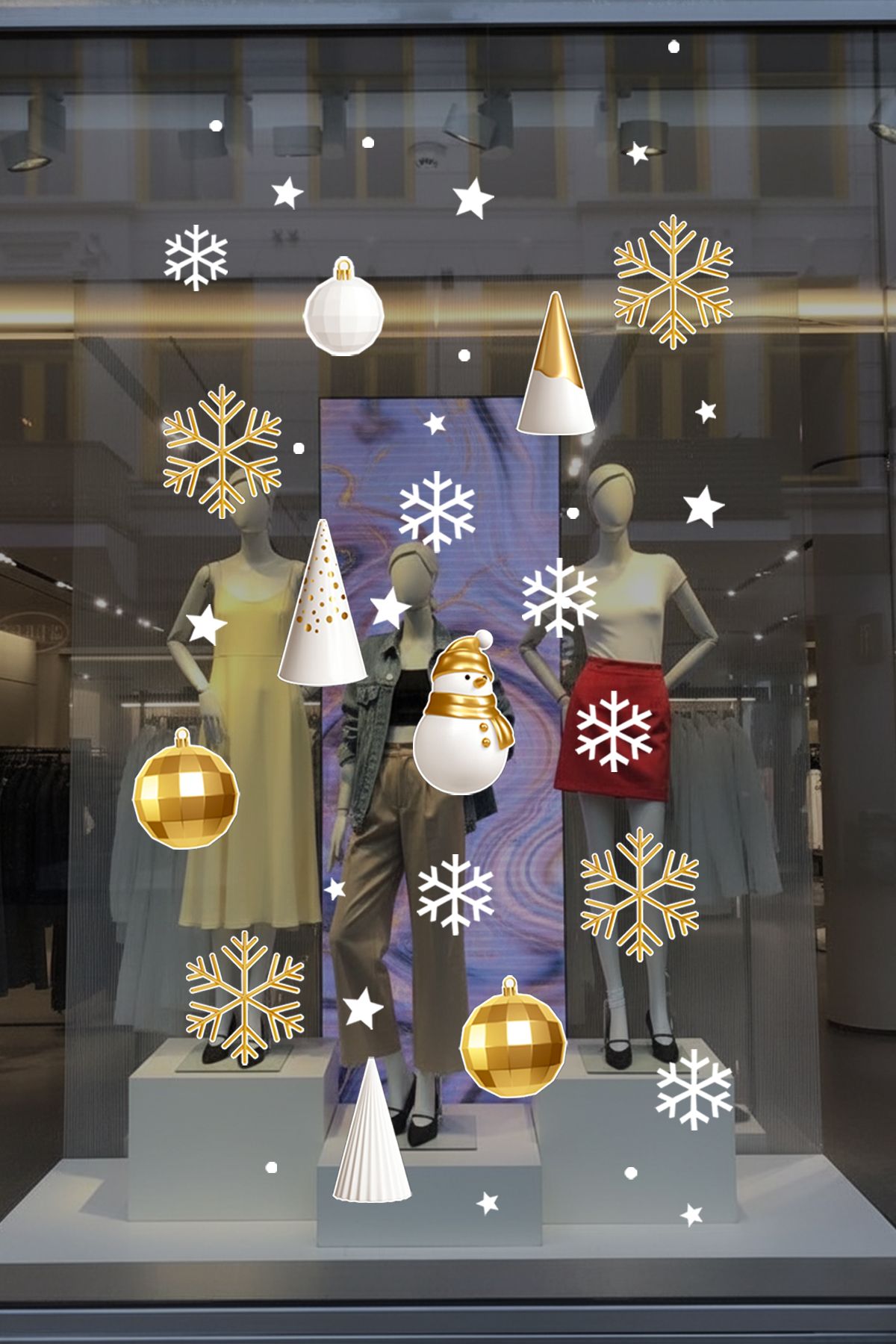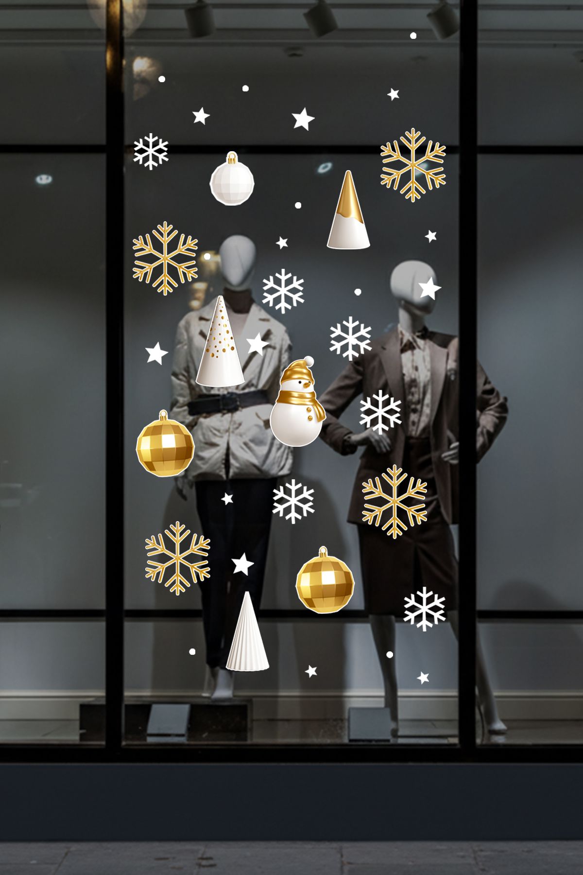 Altın detaylar ve modern yılbaşı figürlerinin birleşimi, vitrininize zarif ve modern bir görünüm kazandırır.