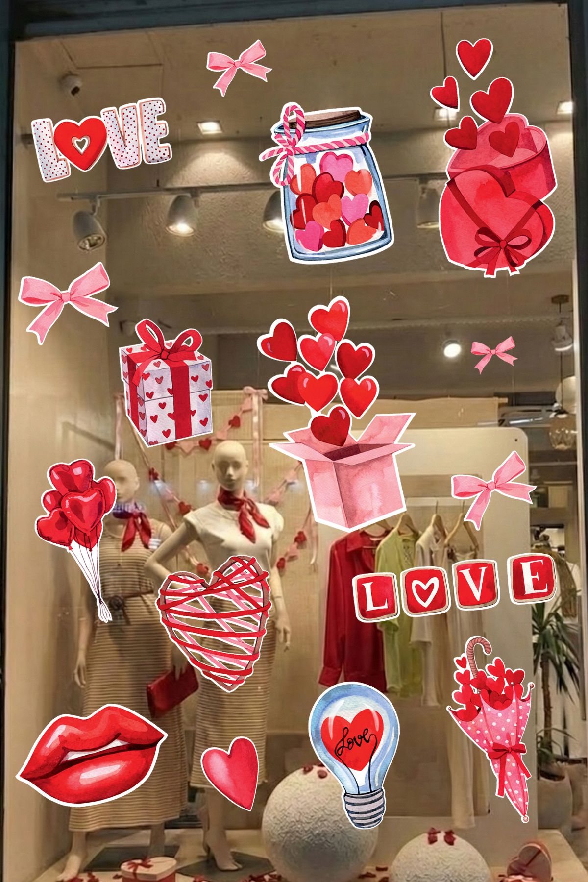 Canlı kırmızı tonları, kalp figürleri, hediye kutuları ve Sevgililer Günü’ne özel illüstrasyonlarla hazırlanan bu sticker seti; vitrinlere enerjik, romantik ve eğlenceli bir karakter kazandırır.