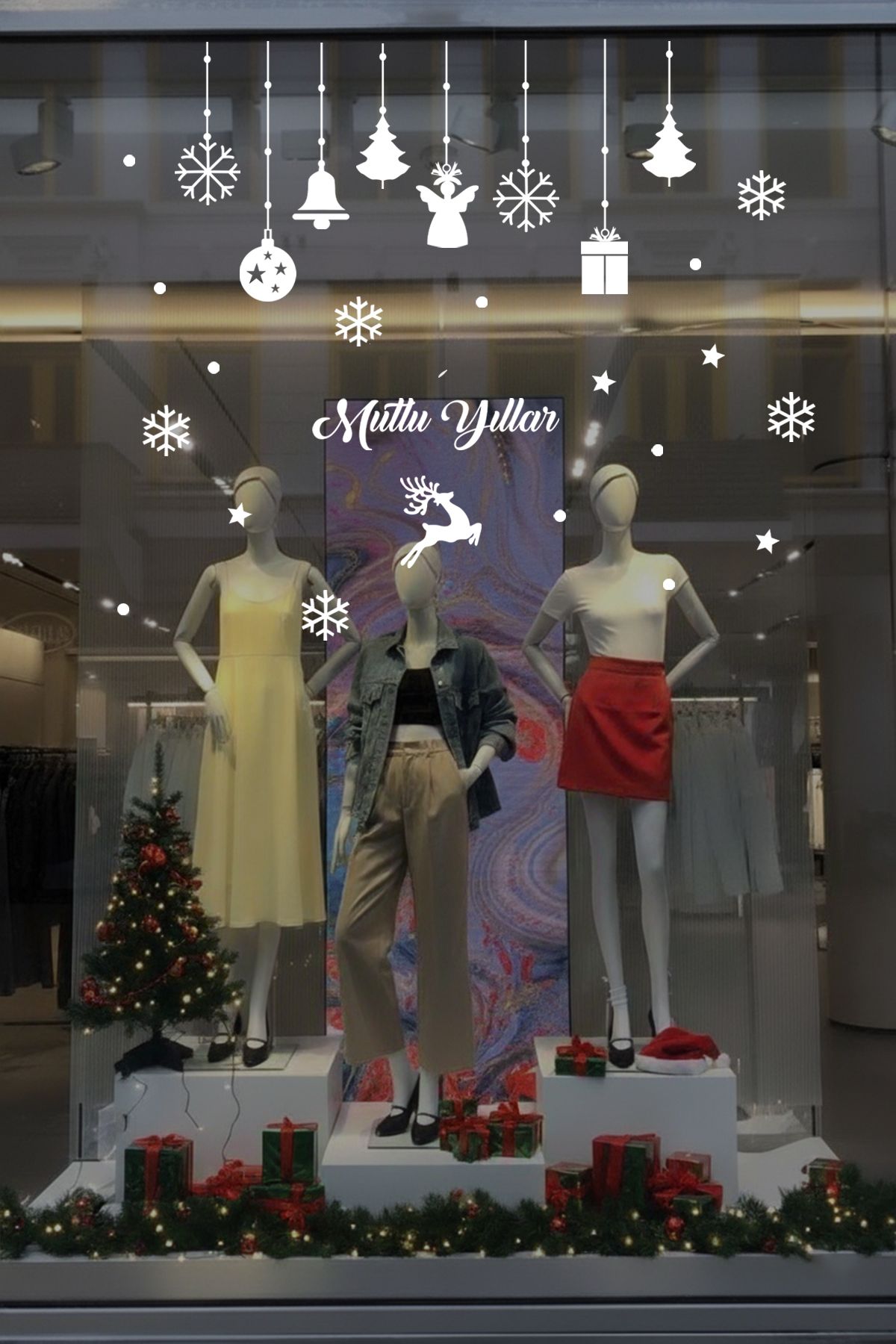 Kar taneleri ve kutuların yer aldığı modern tasarım, vitrinlerinizi eğlenceli ve şık bir şekilde süsler. Bu yılbaşı dekorasyonuna zarif bir dokunuş katmanızı sağlar.