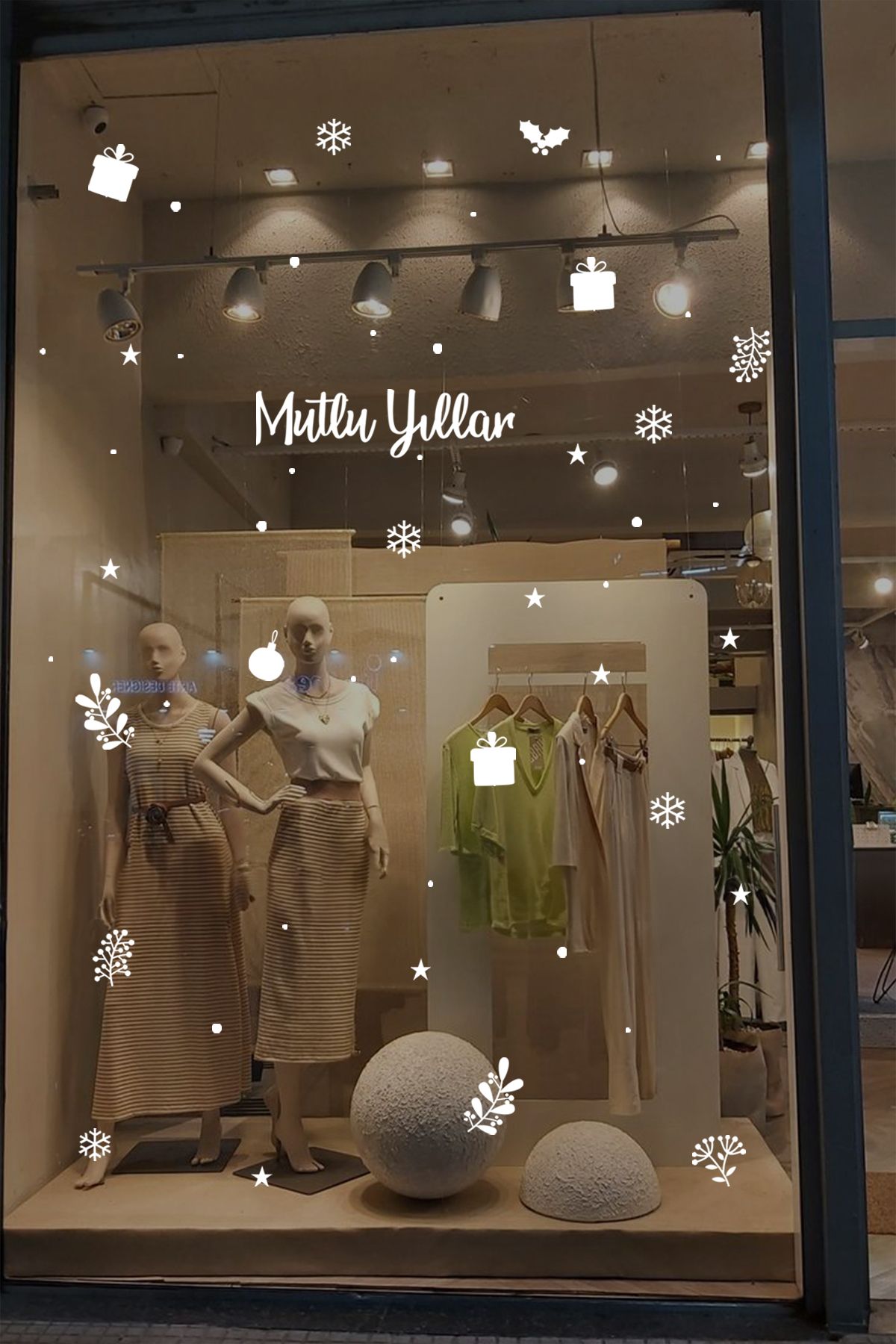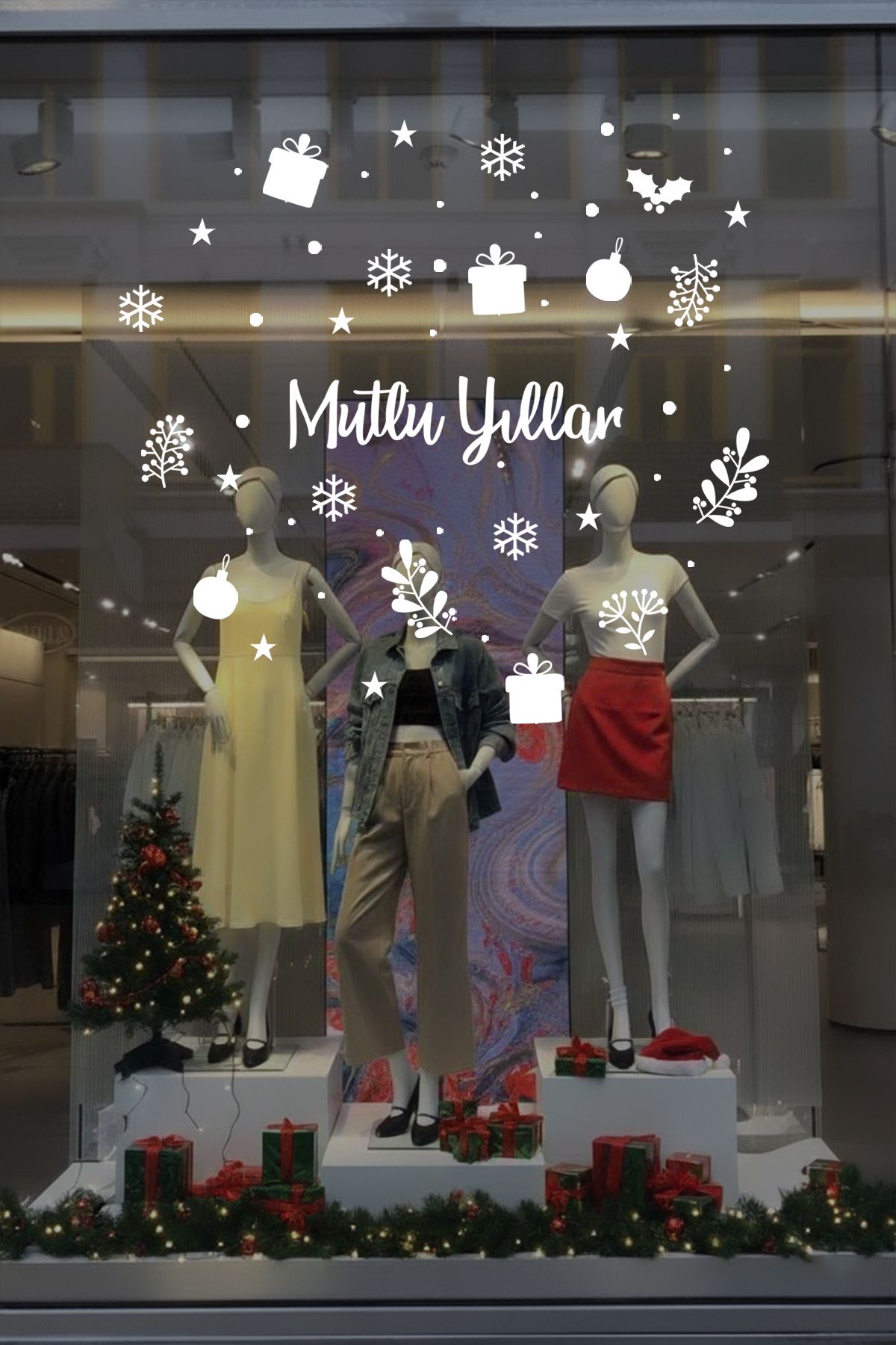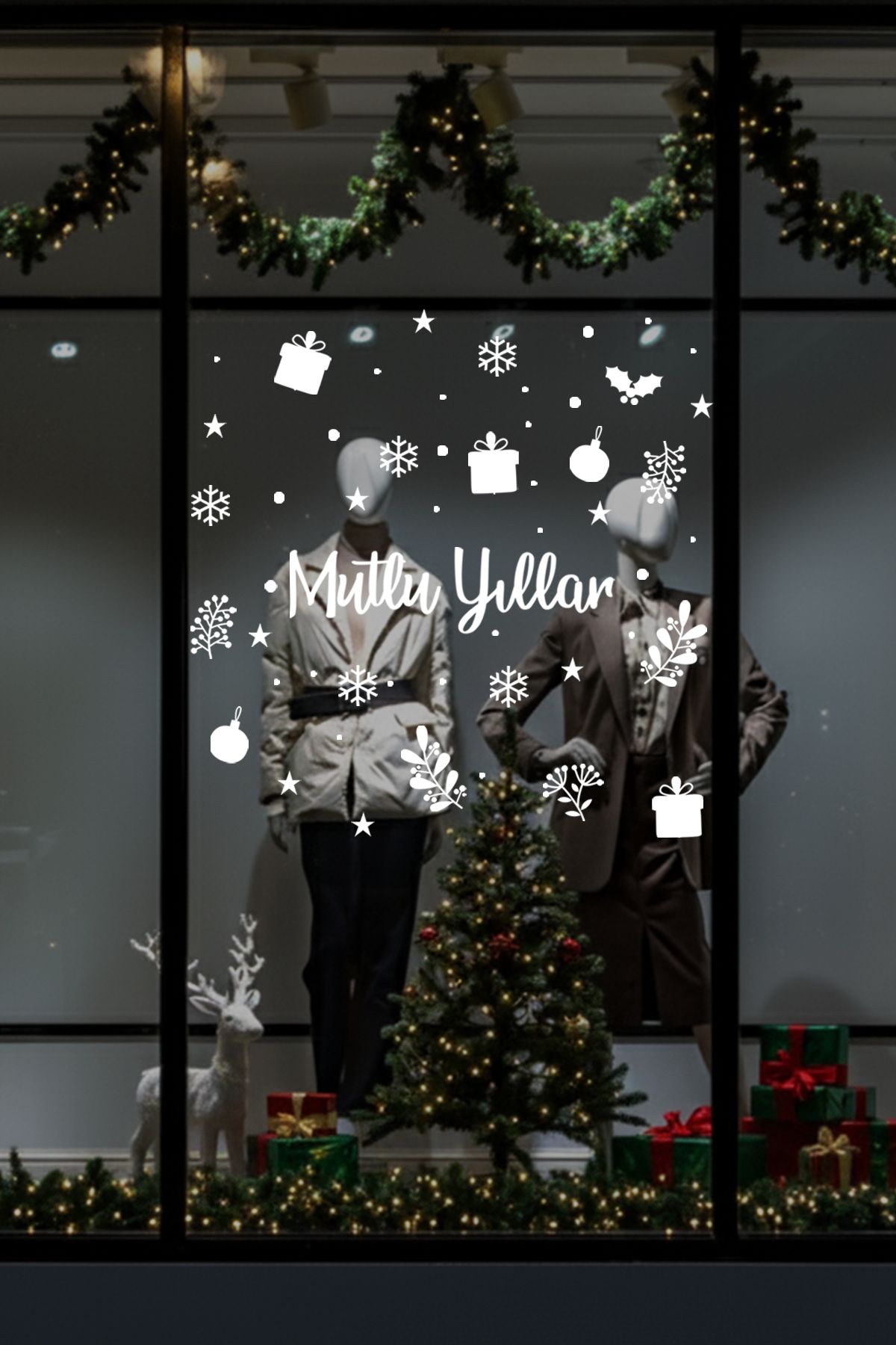 Bu “Mutlu Yıllar” temalı vitrin sticker seti, hediye kutuları, kar taneleri, yılbaşı süsleri ve bitki motifleriyle mağazanıza sıcak, samimi ve yılbaşı ruhunu yansıtan bir görünüm kazandırır. Modern çizim tarzı sayesinde her türlü vitrin dekoruna uyum sağlar. Kendinden yapışkanlı yapısı ile kolayca uygulanır, söküldüğünde iz bırakmaz. Yeni yıl döneminde vitrininize zarif ve dikkat çekici bir atmosfer eklemek isteyen işletmeler için ideal bir dekorasyon ürünüdür.