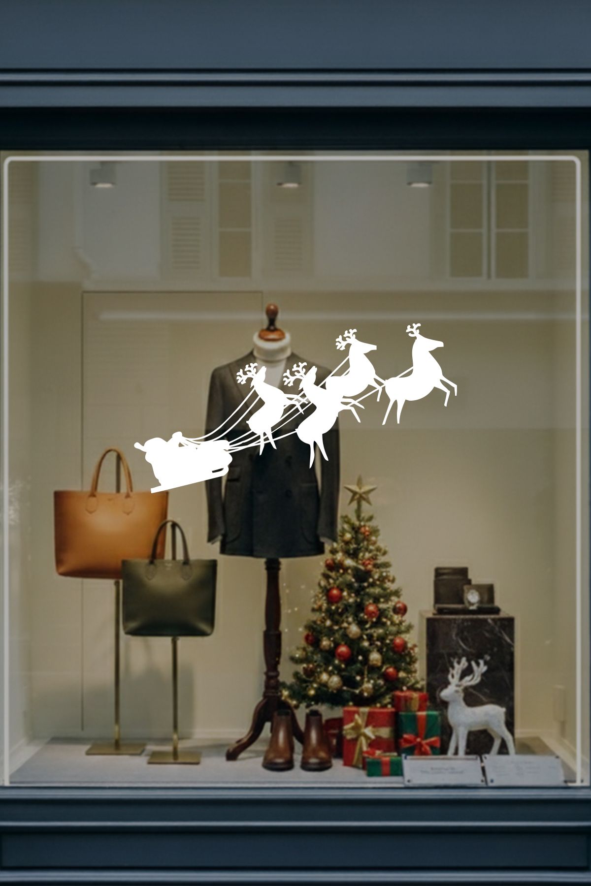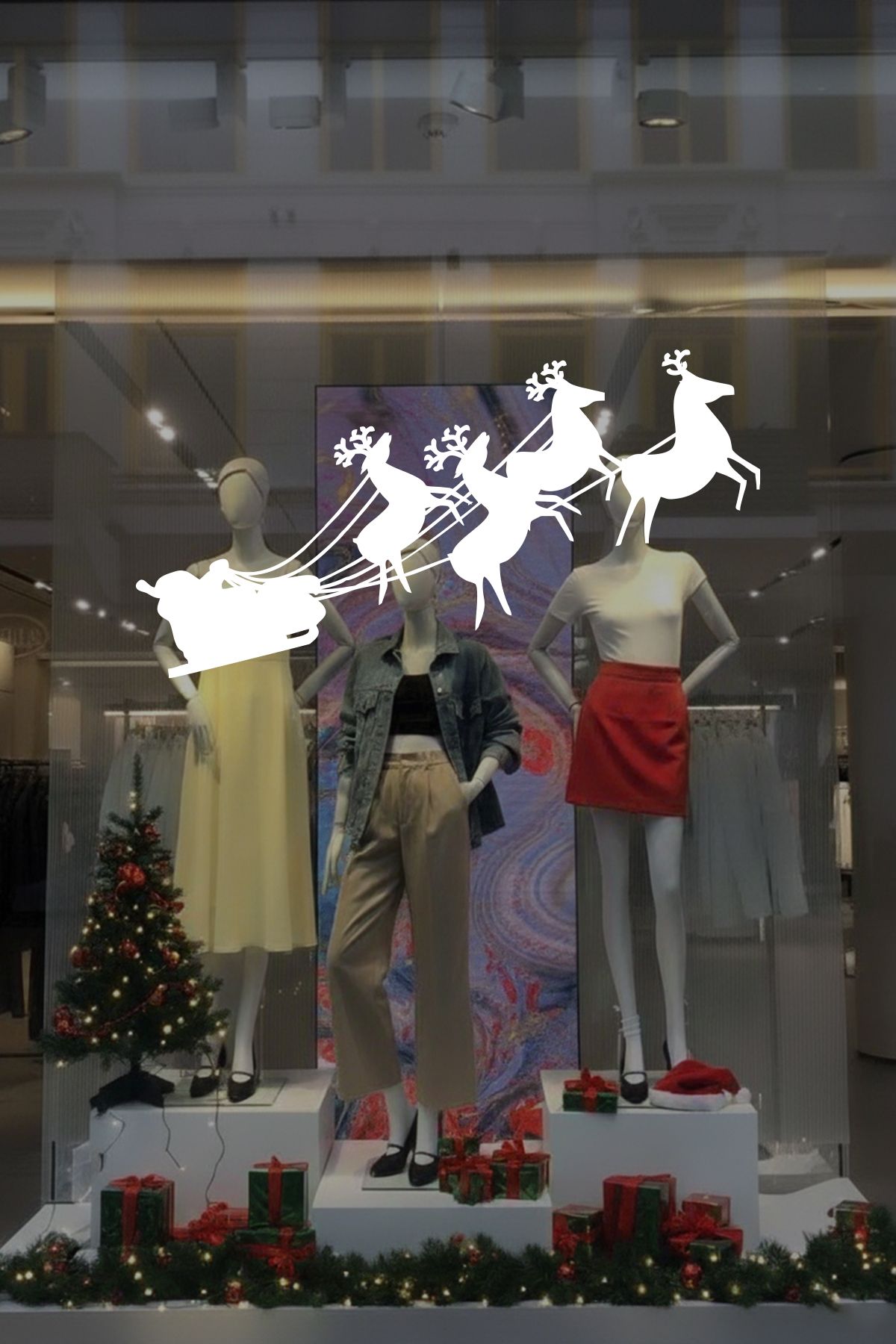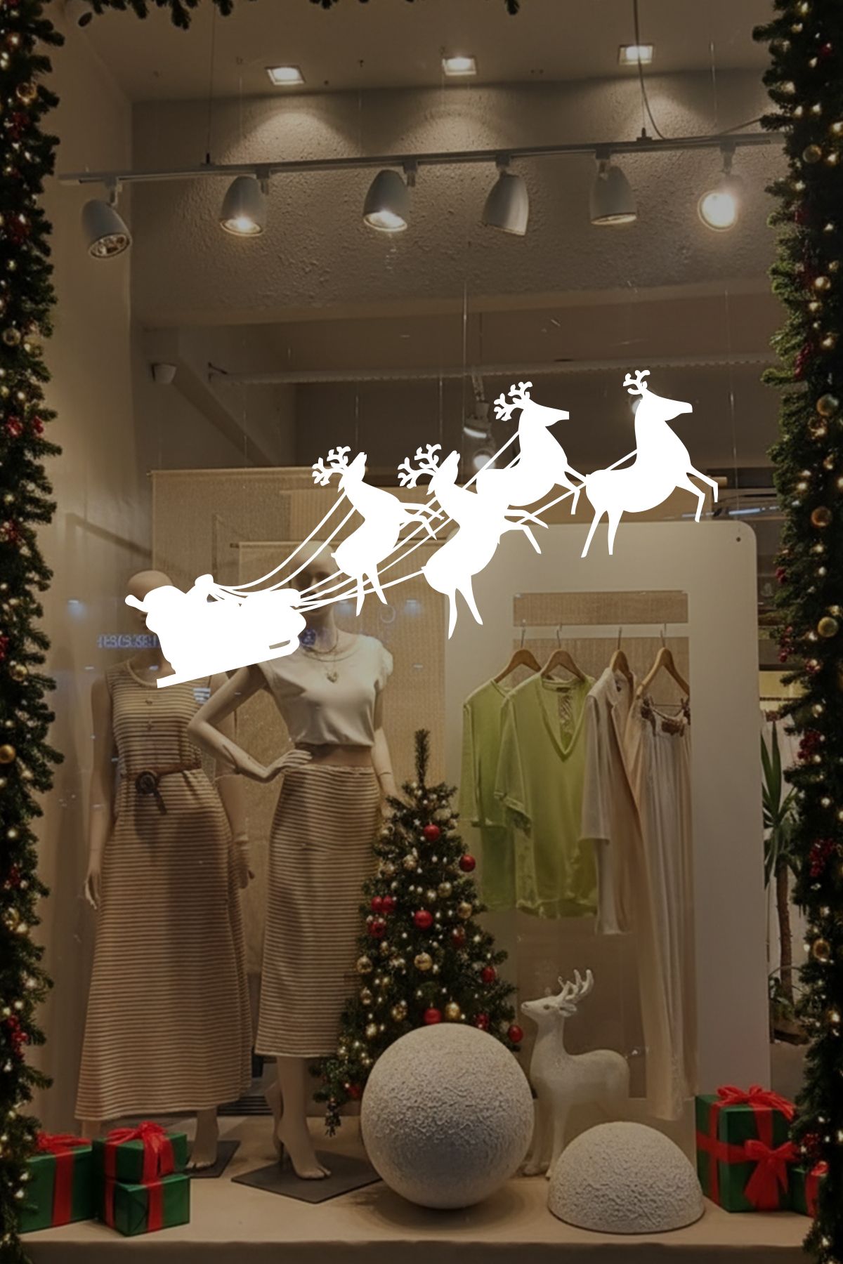 Noel Baba ve geyiklerinin akıcı siluetlerinden oluşan bu özel tasarım, vitrinlere hareket ve enerji katar. Detaylı çizimleriyle yılbaşı ruhunu modern ve etkileyici bir şekilde yansıtır.
